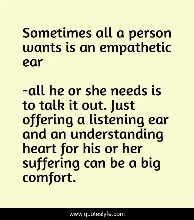 This page presents the quote "Sometimes all a person wants is an empathetic ear". Author of this quote is all he or she needs is to talk it out. Just offering a listening ear and an understanding heart for his or her suffering can be a big comfort.. .