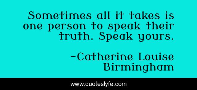 This page presents the quote "Sometimes all it takes is one person to speak their truth. Speak yours.". Author of this quote is Catherine Louise Birmingham. This quote is about self-power, confidence,.