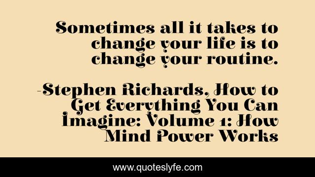 This page presents the quote "Sometimes all it takes to change your life is to change your routine.". Author of this quote is Stephen Richards, How to Get Everything You Can Imagine: Volume 1: How Mind Power Works. This quote is about wishing-for-someday-soon, dreaming, wishing, changes-in-your-life, self-help, stephen-richards-self-help, hope, changes-for-new-hope,.