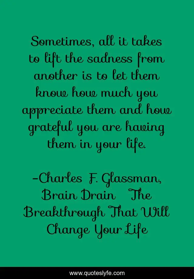 This page presents the quote "Sometimes, all it takes to lift the sadness from another is to let them know how much you appreciate them and how grateful you are having them in your life.". Author of this quote is Charles F. Glassman, Brain Drain The Breakthrough That Will Change Your Life. This quote is about gratitude, appreciation, sadness, inspirational, enthusiasm,.