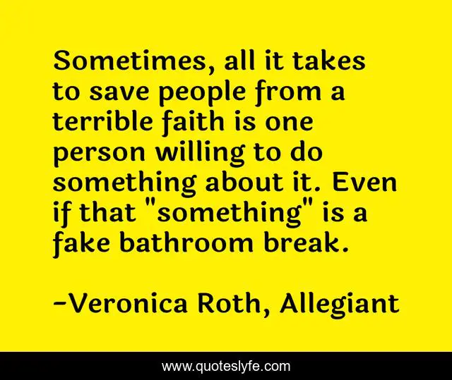 This page presents the quote "Sometimes, all it takes to save people from a terrible faith is one person willing to do something about it. Even if that "something" is a fake bathroom break.". Author of this quote is Veronica Roth, Allegiant. This quote is about allegiant, heroes, friendship,.