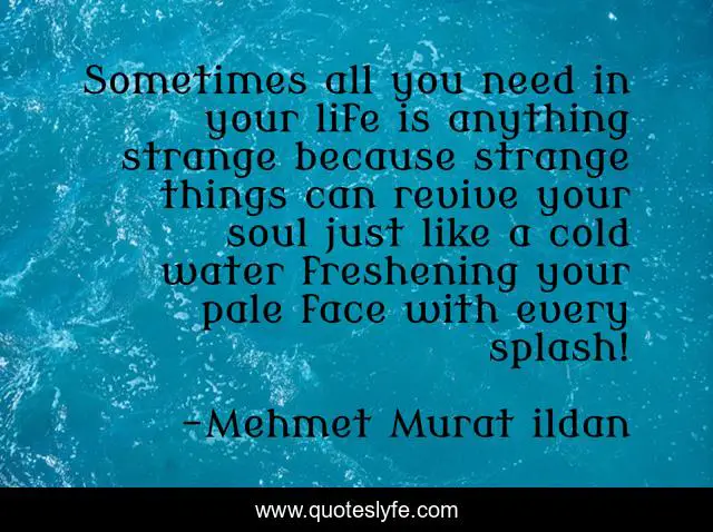 This page presents the quote "Sometimes all you need in your life is anything strange because strange things can revive your soul just like a cold water freshening your pale face with every splash!". Author of this quote is Mehmet Murat ildan. This quote is about life-philosophyi-revive, splash, ildan-words, mehmet-murat-ildan, ildan-wise-sayings, turkish, ildan-wisdom, strange-things, pale-face,.