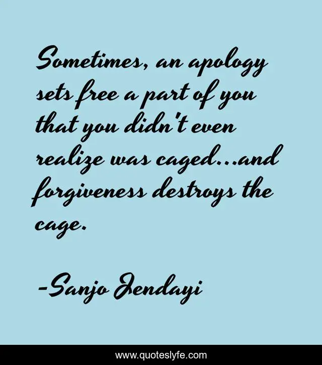 This page presents the quote "Sometimes, an apology sets free a part of you that you didn't even realize was caged...and forgiveness destroys the cage.". Author of this quote is Sanjo Jendayi. This quote is about cage, forgiveness, apology, free, sanjo-jendayi,.