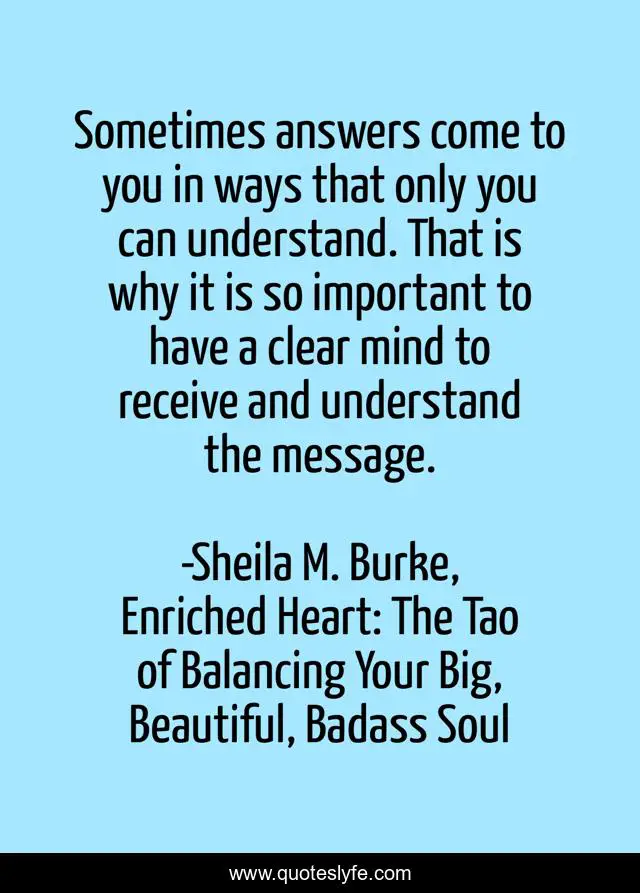 This page presents the quote "Sometimes answers come to you in ways that only you can understand. That is why it is so important to have a clear mind to receive and understand the message.". Author of this quote is Sheila M. Burke, Enriched Heart: The Tao of Balancing Your Big, Beautiful, Badass Soul. This quote is about clear-mind, mind, spiritual, answers,.