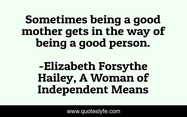 This page presents the quote "Sometimes being a good mother gets in the way of being a good person.". Author of this quote is Elizabeth Forsythe Hailey, A Woman of Independent Means. This quote is about good, mother,.