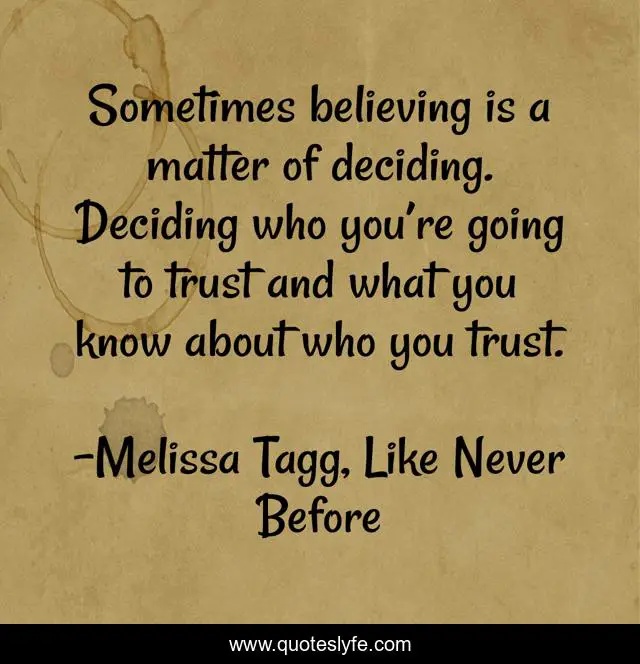 This page presents the quote "Sometimes believing is a matter of deciding. Deciding who you’re going to trust and what you know about who you trust.". Author of this quote is Melissa Tagg, Like Never Before. This quote is about faith, chick-lit, romance, inspirational, romance-novels, enthusiasm,.