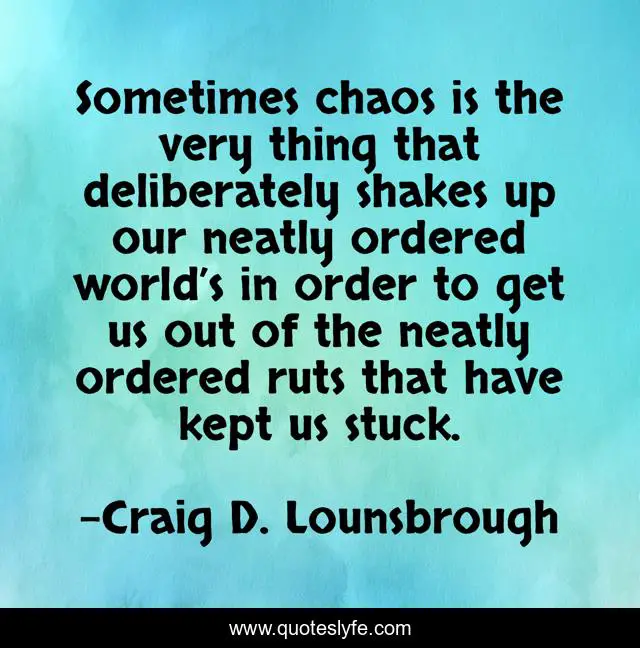 This page presents the quote "Sometimes chaos is the very thing that deliberately shakes up our neatly ordered world’s in order to get us out of the neatly ordered ruts that have kept us stuck.". Author of this quote is Craig D. Lounsbrough. This quote is about redirect, ruts, dislocate, ordered, chaotic, routine, move, chaos, order,.