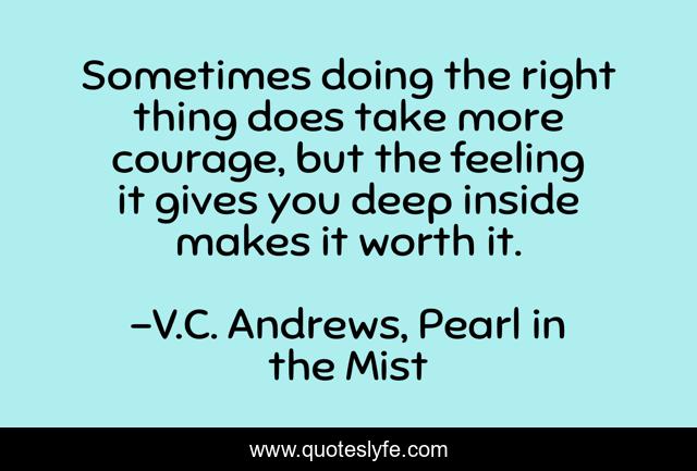 This page presents the quote "Sometimes doing the right thing does take more courage, but the feeling it gives you deep inside makes it worth it.". Author of this quote is V.C. Andrews, Pearl in the Mist. This quote is about right, landry, worth-it, feelings, wrong, courage, 2, wisdom, v-c-andrews,.