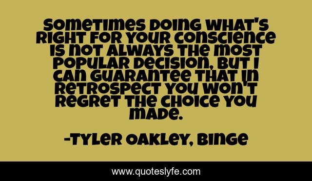 This page presents the quote "Sometimes doing what's right for your conscience is not always the most popular decision, but I can guarantee that in retrospect you won't regret the choice you made.". Author of this quote is Tyler Oakley, Binge. .