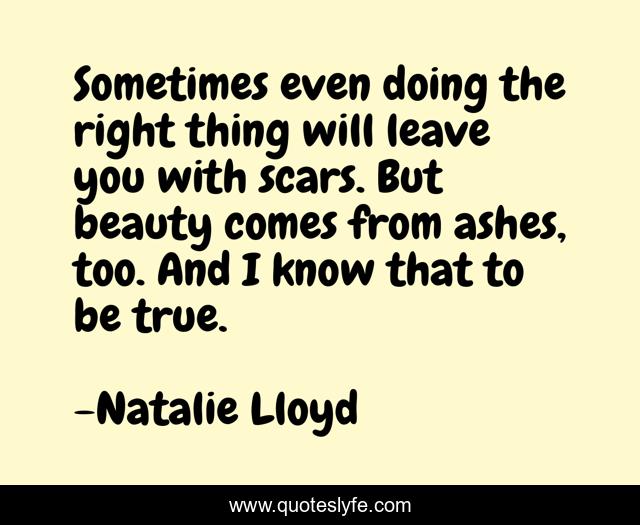 This page presents the quote "Sometimes even doing the right thing will leave you with scars. But beauty comes from ashes, too. And I know that to be true.". Author of this quote is Natalie Lloyd. This quote is about ashes, beauty, bravery,.