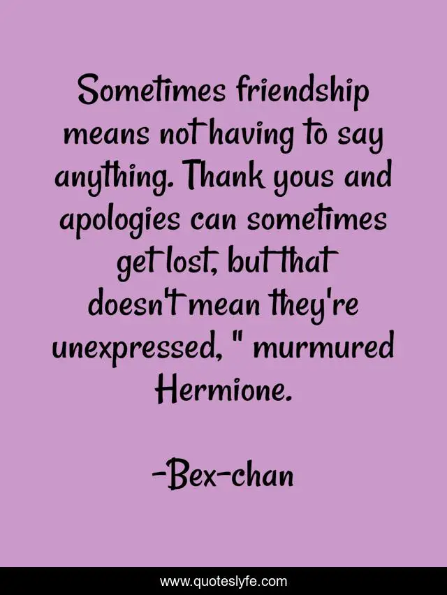 This page presents the quote "Sometimes friendship means not having to say anything. Thank yous and apologies can sometimes get lost, but that doesn't mean they're unexpressed, " murmured Hermione.". Author of this quote is Bex-chan. This quote is about fanfiction-net, hermione-granger, friendship,.