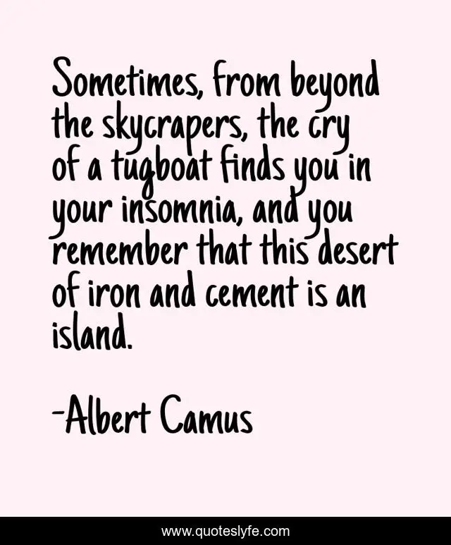 This page presents the quote "Sometimes, from beyond the skycrapers, the cry of a tugboat finds you in your insomnia, and you remember that this desert of iron and cement is an island.". Author of this quote is Albert Camus. .