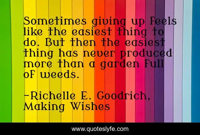 This page presents the quote "Sometimes giving up feels like the easiest thing to do. But then the easiest thing has never produced more than a garden full of weeds.". Author of this quote is Richelle E. Goodrich, Making Wishes. This quote is about dismay, richelle, determination, richelle-e-goodrich, hold-on, depression, giving-up, richelle-goodrich, give-up,.