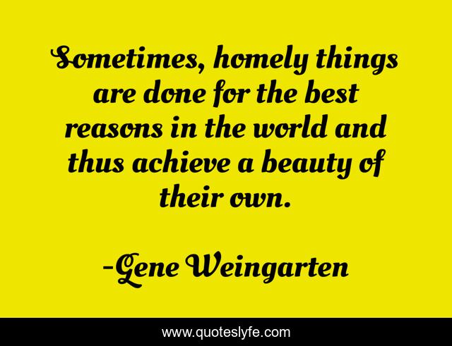 This page presents the quote "Sometimes, homely things are done for the best reasons in the world and thus achieve a beauty of their own.". Author of this quote is Gene Weingarten. This quote is about world, best, achieve,.