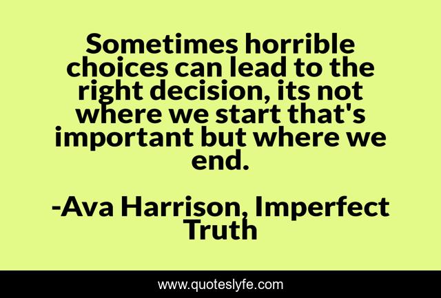 This page presents the quote "Sometimes horrible choices can lead to the right decision, its not where we start that's important but where we end.". Author of this quote is Ava Harrison, Imperfect Truth. This quote is about good, bad, ava-harrison, wrong, right, choices,.