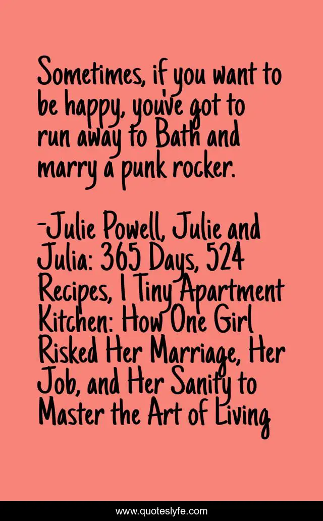 This page presents the quote "Sometimes, if you want to be happy, you've got to run away to Bath and marry a punk rocker.". Author of this quote is Julie Powell, Julie and Julia: 365 Days, 524 Recipes, 1 Tiny Apartment Kitchen: How One Girl Risked Her Marriage, Her Job, and Her Sanity to Master the Art of Living. This quote is about julie-julia, enthusiasm, happy, inspirational, julie-powell,.