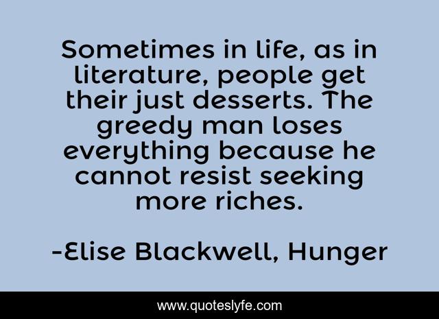 This page presents the quote "Sometimes in life, as in literature, people get their just desserts. The greedy man loses everything because he cannot resist seeking more riches.". Author of this quote is Elise Blackwell, Hunger. This quote is about contentment, greed,.