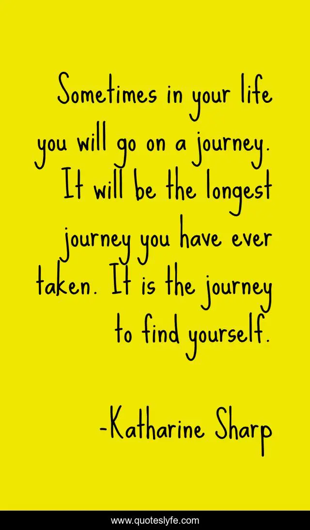 This page presents the quote "Sometimes in your life you will go on a journey. It will be the longest journey you have ever taken. It is the journey to find yourself.". Author of this quote is Katharine Sharp. This quote is about life, journey, self,.