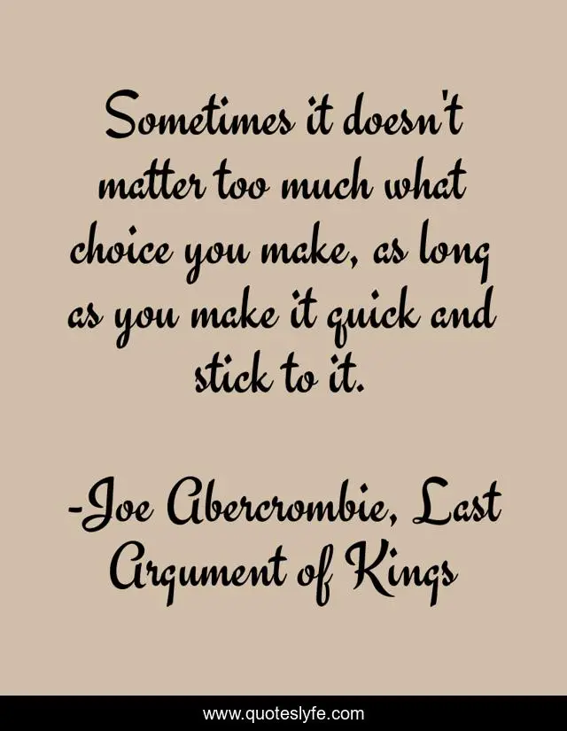 This page presents the quote "Sometimes it doesn't matter too much what choice you make, as long as you make it quick and stick to it.". Author of this quote is Joe Abercrombie, Last Argument of Kings. .