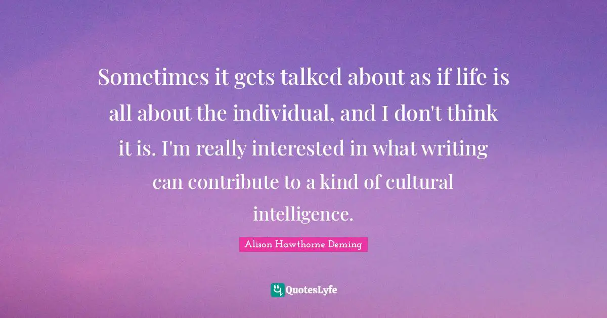 This page presents the quote "Sometimes it gets talked about as if life is all about the individual, and I don't think it is. I'm really interested in what writing can contribute to a kind of cultural intelligence.". Author of this quote is Alison Hawthorne Deming. This quote is about writing, sometimes, life is, individual, intelligence, thinking, kind,.