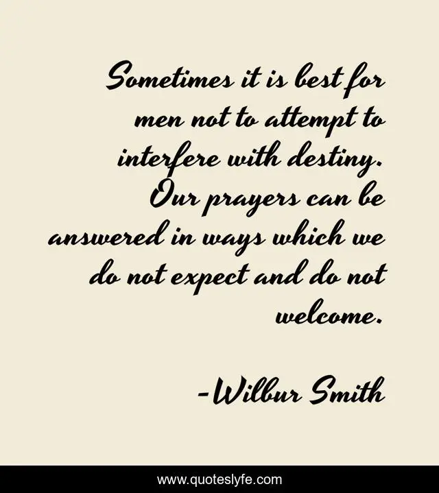 This page presents the quote "Sometimes it is best for men not to attempt to interfere with destiny. Our prayers can be answered in ways which we do not expect and do not welcome.". Author of this quote is Wilbur Smith. This quote is about acceptance, cautionary, fate, destiny,.