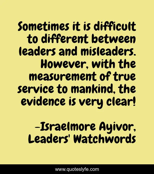 This page presents the quote "Sometimes it is difficult to different between leaders and misleaders. However, with the measurement of true service to mankind, the evidence is very clear!". Author of this quote is Israelmore Ayivor, Leaders' Watchwords. This quote is about different, leaders, service, difficult, food-for-thought, evidence, leadership, mankind, measurement,.