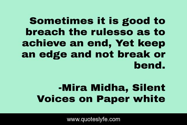 This page presents the quote "Sometimes it is good to breach the rulesso as to achieve an end, Yet keep an edge and not break or bend.". Author of this quote is Mira Midha, Silent Voices on Paper white. .