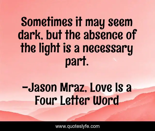 This page presents the quote "Sometimes it may seem dark, but the absence of the light is a necessary part.". Author of this quote is Jason Mraz, Love Is a Four Letter Word. This quote is about songwriter, song, song-lyrics,.