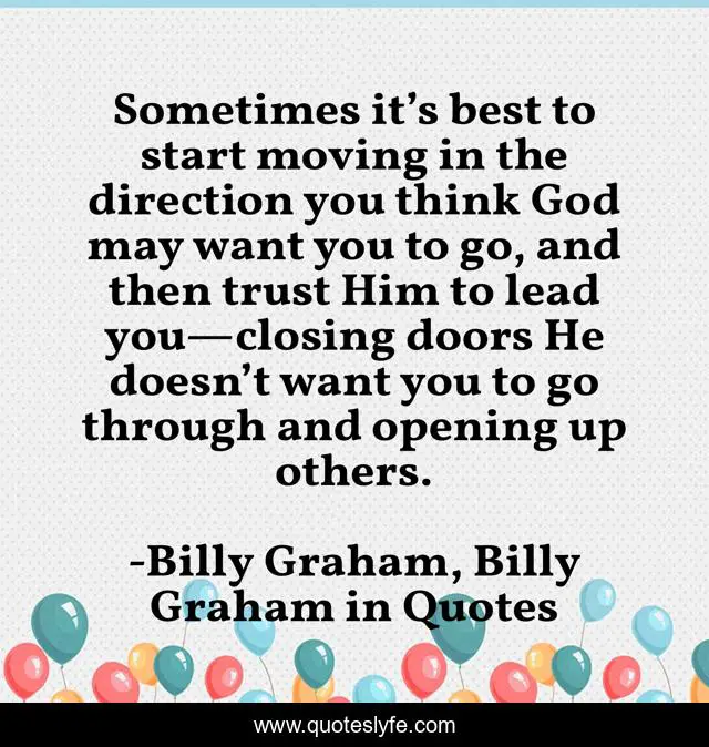 This page presents the quote "Sometimes it’s best to start moving in the direction you think God may want you to go, and then trust Him to lead you—closing doors He doesn’t want you to go through and opening up others.". Author of this quote is Billy Graham, Billy Graham in Quotes. This quote is about god-s-will, billy-graham,.