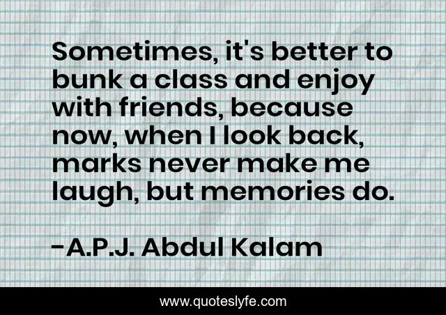 This page presents the quote "Sometimes, it's better to bunk a class and enjoy with friends, because now, when I look back, marks never make me laugh, but memories do.". Author of this quote is A.P.J. Abdul Kalam. This quote is about fun, memories, school, friends,.