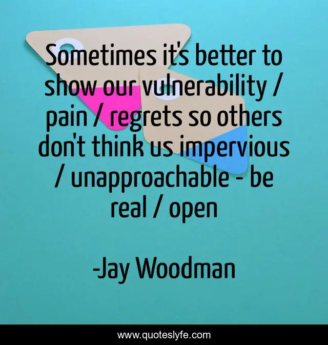 This page presents the quote "Sometimes it's better to show our vulnerability / pain / regrets so others don't think us impervious / unapproachable - be real / open". Author of this quote is Jay Woodman. This quote is about real, pain, impervious, vulnerability, unapproachable, openness, open, regrets, vulnerable,.