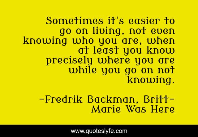 This page presents the quote "Sometimes it's easier to go on living, not even knowing who you are, when at least you know precisely where you are while you go on not knowing.". Author of this quote is Fredrik Backman, Britt-Marie Was Here. This quote is about enthusiasm, life, hope, inspirational, sad,.