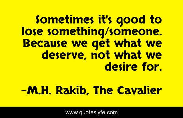 This page presents the quote "Sometimes it's good to lose something/someone. Because we get what we deserve, not what we desire for.". Author of this quote is M.H. Rakib, The Cavalier. This quote is about desire, life, destiny, people, deserve, quote, quotation,.
