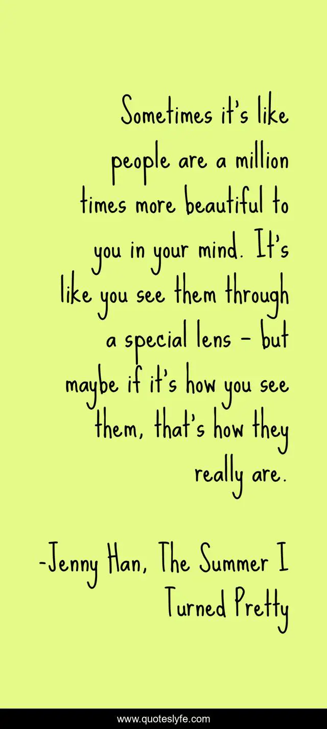 This page presents the quote "Sometimes it’s like people are a million times more beautiful to you in your mind. It’s like you see them through a special lens — but maybe if it’s how you see them, that’s how they really are.". Author of this quote is Jenny Han, The Summer I Turned Pretty. This quote is about the-summer-i-turned-pretty, jenny-han, love, beauty, attraction, affection,.
