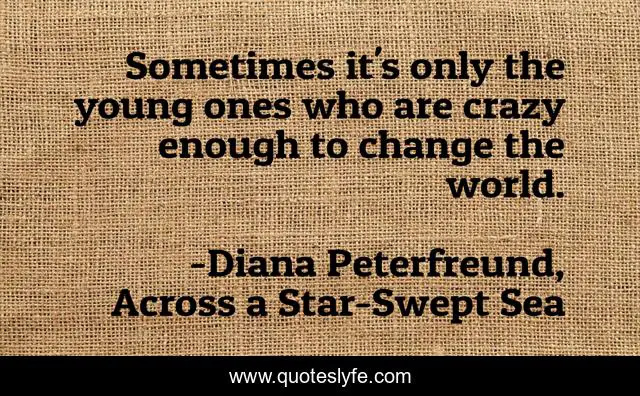 This page presents the quote "Sometimes it's only the young ones who are crazy enough to change the world.". Author of this quote is Diana Peterfreund, Across a Star-Swept Sea. This quote is about idealism, youth, revolution,.