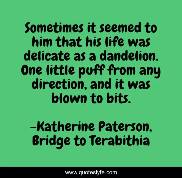 This page presents the quote "Sometimes it seemed to him that his life was delicate as a dandelion. One little puff from any direction, and it was blown to bits.". Author of this quote is Katherine Paterson, Bridge to Terabithia. .