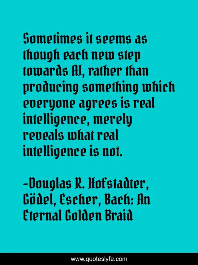 This page presents the quote "Sometimes it seems as though each new step towards AI, rather than producing something which everyone agrees is real intelligence, merely reveals what real intelligence is not.". Author of this quote is Douglas R. Hofstadter, Gödel, Escher, Bach: An Eternal Golden Braid. This quote is about ai, intelligence, humanity,.