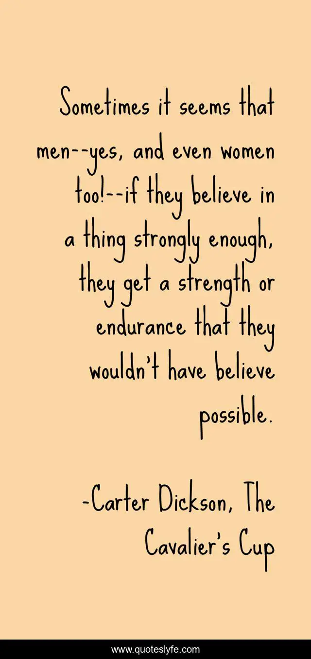 This page presents the quote "Sometimes it seems that men--yes, and even women too!--if they believe in a thing strongly enough, they get a strength or endurance that they wouldn't have believe possible.". Author of this quote is Carter Dickson, The Cavalier's Cup. This quote is about endurance, strength, belief,.