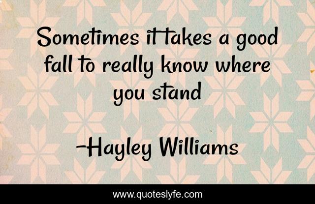 This page presents the quote "Sometimes it takes a good fall to really know where you stand". Author of this quote is Hayley Williams. This quote is about knowing, singer, paramore, success, life, understanding, stand, truth, falling,.