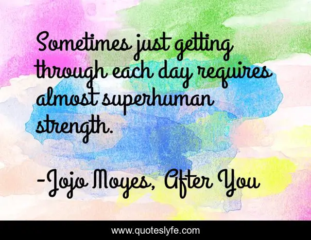 This page presents the quote "Sometimes just getting through each day requires almost superhuman strength.". Author of this quote is Jojo Moyes, After You. This quote is about life-lesson, romance, fiction,.