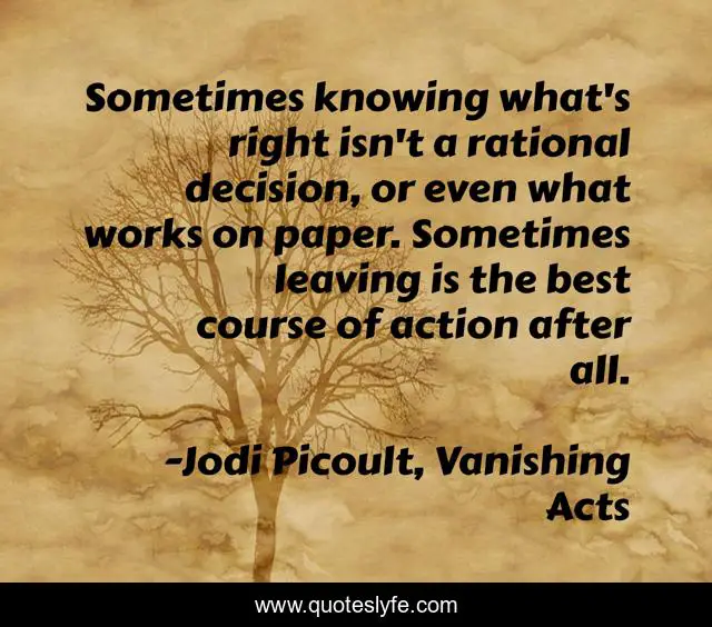 This page presents the quote "Sometimes knowing what's right isn't a rational decision, or even what works on paper. Sometimes leaving is the best course of action after all.". Author of this quote is Jodi Picoult, Vanishing Acts. This quote is about leave, right, avtion, rational,.