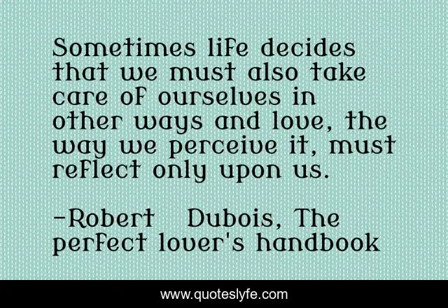 This page presents the quote "Sometimes life decides that we must also take care of ourselves in other ways and love, the way we perceive it, must reflect only upon us.". Author of this quote is Robert Dubois, The perfect lover's handbook. This quote is about life, love, inspirational, lover, enthusiasm, affection,.