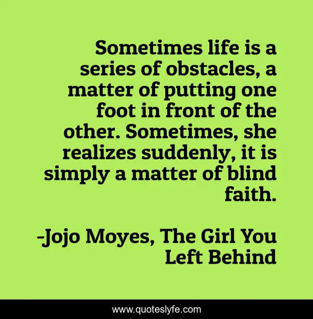 This page presents the quote "Sometimes life is a series of obstacles, a matter of putting one foot in front of the other. Sometimes, she realizes suddenly, it is simply a matter of blind faith.". Author of this quote is Jojo Moyes, The Girl You Left Behind. .