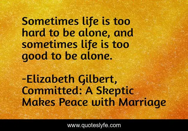 This page presents the quote "Sometimes life is too hard to be alone, and sometimes life is too good to be alone.". Author of this quote is Elizabeth Gilbert, Committed: A Skeptic Makes Peace with Marriage. This quote is about alone, life,.