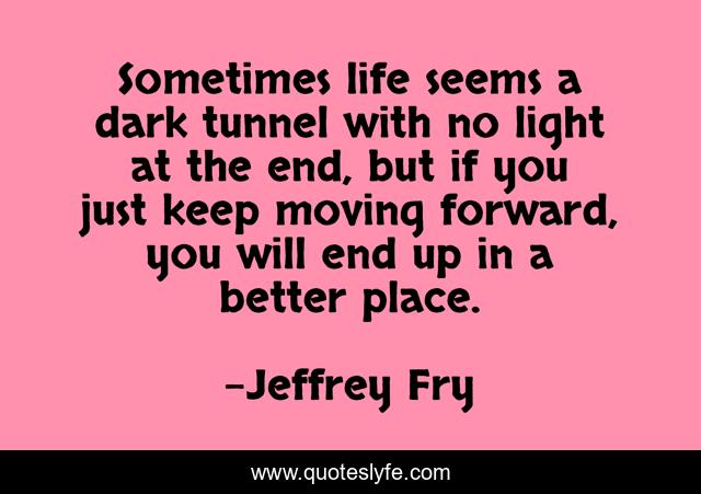 This page presents the quote "Sometimes life seems a dark tunnel with no light at the end, but if you just keep moving forward, you will end up in a better place.". Author of this quote is Jeffrey Fry. This quote is about better-place, life, end, tunnel, sometimes, seems, keep-moving, will-end-up, dark,.