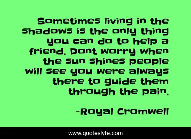 This page presents the quote "Sometimes living in the shadows is the only thing you can do to help a friend. Dont worry when the sun shines people will see you were always there to guide them through the pain.". Author of this quote is Royal Cromwell. This quote is about friends, pain,.