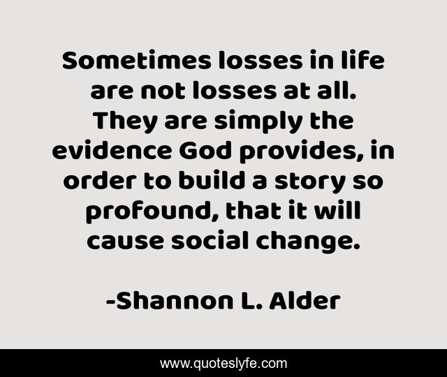This page presents the quote "Sometimes losses in life are not losses at all. They are simply the evidence God provides, in order to build a story so profound, that it will cause social change.". Author of this quote is Shannon L. Alder. This quote is about case, strength, social-change, activism, novels, choices, preparation, future, true-stories,.