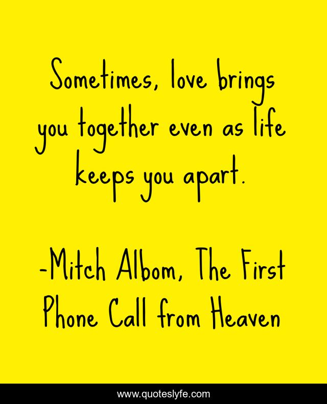 "Mitch Albom, The First Phone Call from Heaven Quotes." Quoteslyfe.com, 2025. Tue. 09 Dec. 2025. <https://www.quoteslyfe.com/quote/Sometimes-love-brings-you-together-even-as-3496>.