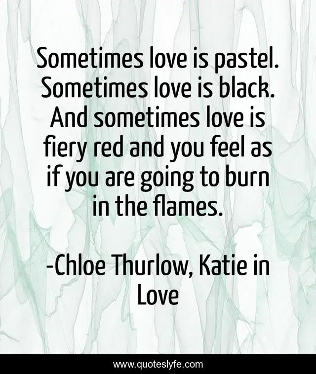 This page presents the quote "Sometimes love is pastel. Sometimes love is black. And sometimes love is fiery red and you feel as if you are going to burn in the flames.". Author of this quote is Chloe Thurlow, Katie in Love. This quote is about love-q, love, affection, love-hurts,.