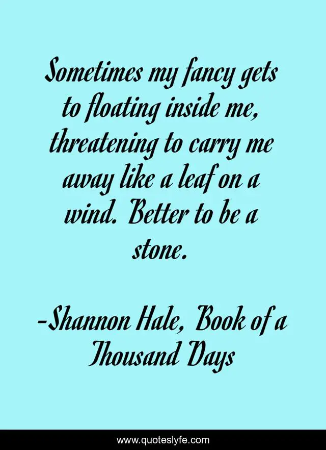 This page presents the quote "Sometimes my fancy gets to floating inside me, threatening to carry me away like a leaf on a wind. Better to be a stone.". Author of this quote is Shannon Hale, Book of a Thousand Days. This quote is about hope, reality,.